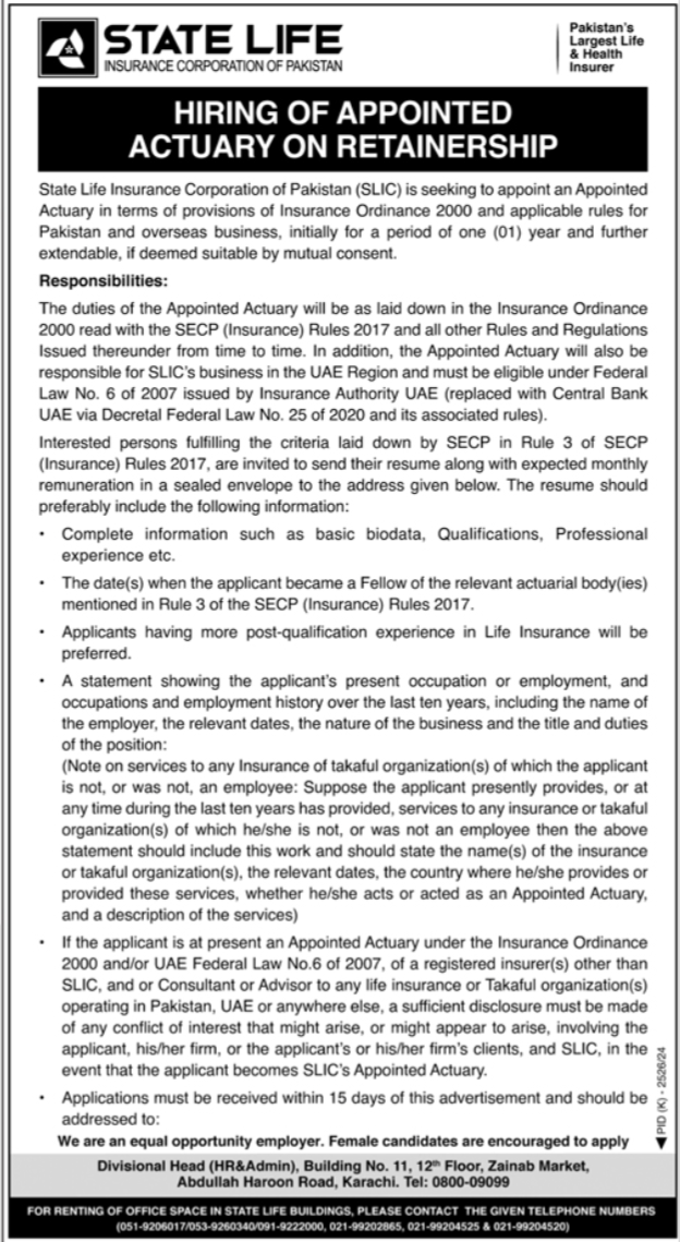 State Life Insurance Corporation of Pakistan (SLIC) is seeking to appoint an Appointed Actuary on a retainership basis. This role is for overseeing insurance-related actuarial matters under the Insurance Ordinance 2000 and SECP (Insurance) Rules 2017. The position is initially for one (01) year, with the possibility of extension based on mutual agreement.