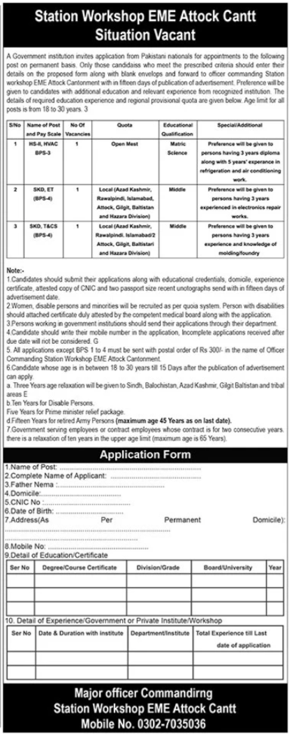 - Applications for BPS-4 positions must include a postal order of Rs. 300 in the name of Officer Commanding Station Workshop EME Attock Cantonment.