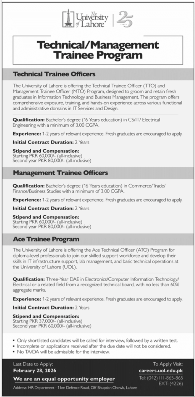 The University of Lahore is offering the Technical Trainee Officer (TTO) and Management Trainee Officer (MTO) Program, along with the Ace Trainee Program. This initiative is designed to groom and retain fresh graduates in Information Technology and Business Management. The program provides comprehensive exposure, training, and hands-on experience across various functional and administrative domains.