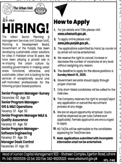 - For job details and TORs, visit www.urbanunit.gov.pk.