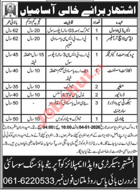 The WAPDA Employees Co-operative Housing Society (Multan) has announced various job opportunities for experienced professionals and support staff. These positions are primarily targeted towards retired individuals or those with significant field experience. The roles range from high-level administrative and technical positions, such as S.D.O and Admin/HR Officer, to support roles like Drivers, Helpers, and Security Supervisors.