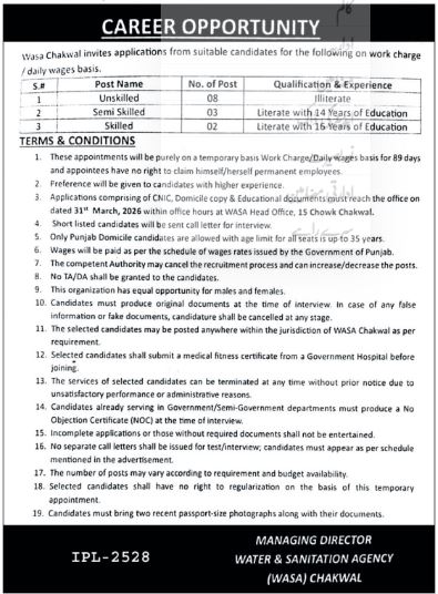 Water and Sanitation Agency (WASA) Chakwal has announced new career opportunities for various positions on a work charge and daily wages basis. These appointments are being made to fulfill the operational requirements of the agency in the Chakwal region. The hiring is purely on a temporary basis for a period of 89 days.